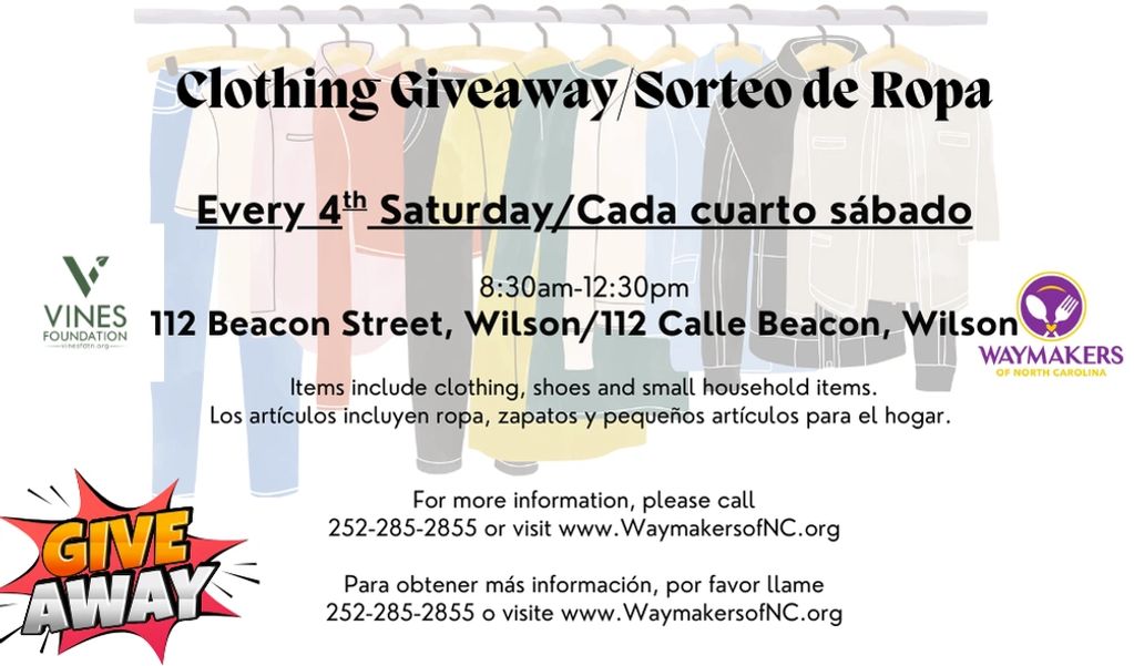 Next clothing giveaway is Saturday, September 27th at 112 Beacon Street in Wilson.